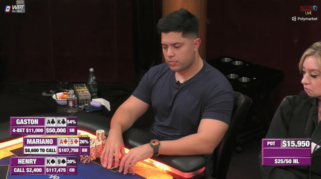Next to act was Mariano, who also looked down at A♥K♣. Not one to slow-play too often, Mariano popped it up to $9k, which probably made Armen Hammer worry about his hand.