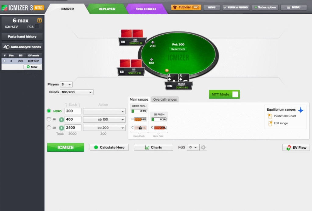 ICMIZER is a powerful poker training tool that lets you train late-game tournament poker push/fold situations while doing the calculations in the background.